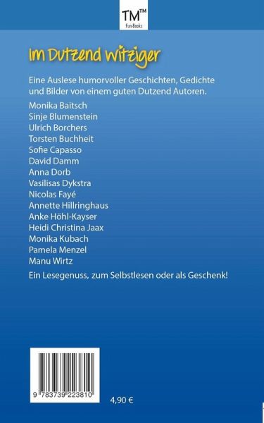 Eine Auslese humorvoller Geschichten, Gedichte und Bilder von einem guten Dutzend Autoren: Monika Baitsch, Sinje Blumenstein, Ulrich Borchers, Torsten Buchheit, Sofie Capasso, David Damm, Anna Dorb, Vasilisas Dykstra, Nicolas Fayé, Annette Hillringhaus, Anke Höhl-Kayser, Heidi Christina Jaax, Monika Kubach, Pamela Menzel, Manu Wirtz. Ein Lesegenuss, zum Selbstlesen oder als Geschenk!