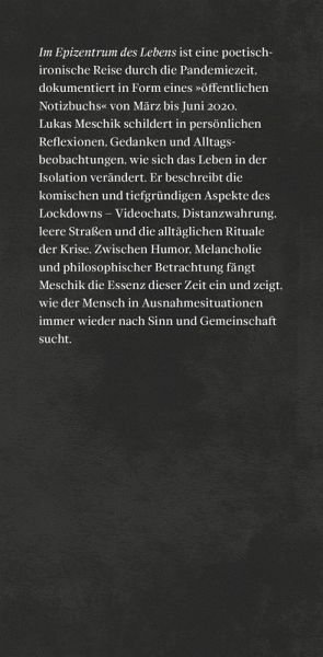 Zwischen Doughnut-Tagen und Maulkorbpflicht für Mensch und Hund, zwischen Nachrichtenflut und gedanklicher Abschweifung entsteht eine poetisch-ironische Reise durch die Pandemiezeit, dokumentiert in Form eines Notiz- und Tagebuchs. Zwischen Humor, Melancholie und philosophischer Betrachtung fängt Meschik die Essenz dieser Zeit ein und zeigt, wie der Mensch in Ausnahmesituationen immer wieder nach Sinn und Gemeinschaft sucht.