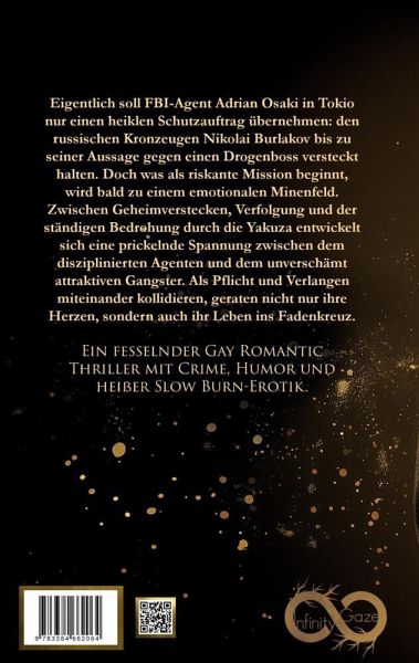 Eigentlich soll FBI-Agent Adrian Osaki in Tokio nur einen heiklen Schutzauftrag übernehmen: den russischen Kronzeugen Nikolai Burlakov bis zu seiner Aussage gegen einen Drogenboss versteckt halten. Doch was als riskante Mission beginnt, wird bald zu einem emotionalen Minenfeld. Zwischen Geheimverstecken, Verfolgung und der ständigen Bedrohung durch die Yakuza entwickelt sich eine prickelnde Spannung zwischen dem disziplinierten Agenten und dem unverschämt attraktiven Gangster. Als Pflicht und Verlangen miteinander kollidieren, geraten nicht nur ihre Herzen, sondern auch ihr Leben ins Fadenkreuz.Ein fesselnder Gay Romantic Thriller mit Crime, Humor und heißer Slow Burn-Erotik.