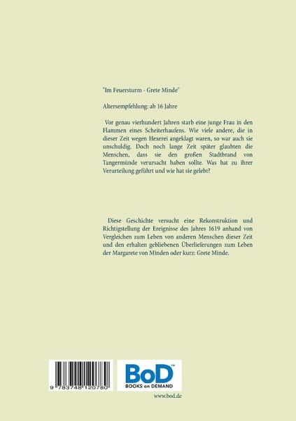 "Im Feuersturm - Grete Minde"Altersempfehlung: ab 16 JahreVor genau vierhundert Jahren starb eine junge Frau in den Flammen eines Scheiterhaufens. Wie viele andere, die in dieser Zeit wegen Hexerei angeklagt waren, so war auch sie unschuldig. Doch noch lange Zeit später glaubten die Menschen, dass sie den großen Stadtbrand von Tangermünde verursacht haben sollte. Was hat zu ihrer Verurteilung geführt und wie hat sie gelebt?Diese Geschichte versucht eine Rekonstruktion und Richtigstellung der Ereignisse des Jahres 1619 anhand von Vergleichen zum Leben von anderen Menschen dieser Zeit und den erhalten gebliebenen Überlieferungen zum Leben der Margarete von Minden oder kurz: Grete Minde.Die weiteren Bücher in dieser Reihe, erschienen im Verlag BoD, sind:"Der Gefolgsmann des Königs" ISBN 978-3-7357-2281-2 (05.08.2014)"In den finsteren Wäldern Sachsens" ISBN 978-3-7357-7982-3 (29.09.2014)"Schicha und der Clan der Bären" ISBN: 978-3-7386-0262-3 (24.11.2014)"Im Zeichen des Löwen" ISBN: 978-3-7347-5911-6 (27.02.2015)"Im Schein der Hexenfeuer" ISBN: 978-3-7347-7925-1 (22.06.2015)"Kaperfahrt gegen die Hanse" ISBN: 978-3-7386-2392-5 (24.08.2015)"Die Bruderschaft des Regenbogens" ISBN: 978-3-7386-5136-2 (23.11.2015)"Die römische Münze" ISBN: 978-3-7392-1843-4 (19.02.2016)"Die Räubermühle" ISBN: 978-3-8482-0893-7 (30.05.2016)"Der russische Dolch" ISBN: 978-3-7412-3828-4 (25.08.2016)"Das Schwert des Gladiators" ISBN: 978-3-7412-9042-8 (29.11.2016)"Frauenwege und Hexenpfade" ISBN: 978-3-7448-3364-6 (27.06.2017)"Die Sklavin des Sarazenen" ISBN: 978-3-7448-5151-0 (26.07.2017)"Die Tochter aus dem Wald" ISBN: 978-3-7448-9330-5 (28.09.2017)"Anna und der Kurfürst" ISBN: 978-3-7448-8200-2 (20.11.2017)"Westwärts auf Drachenbooten" ISBN: 978-3-7460-7871-7 (26.02.2018)"Nur ein Hexenleben..." ISBN: 978-3-7460-7399-6 (24.04.2018)"Sturm über den Stämmen" ISBN: 978-3-7528-7710-6 (23.07.2018)"Die Rache der Barbarin" ISBN: 978-3-7528-4103-9 (01.10.2018)Weitere Informationen finden Sie unter www.buch.goeritz-netz.de