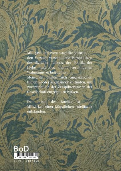 Mit Lyrik und Prosa wagt die Autorin den Versuch verschiedene Perspektiven des täglichen Lebens, der Politik, der Liebe und des damit verbundenen Wahnsinns zu beleuchten. Menschen dürfen sich angesprochen fühlen wieder zueinander zu finden, um zuversichtlich der Zersplitterung in der Gesellschaft entgegenzuwirken. Der Inhalt des Buches ist ohne Mitwirken einer künstlichen Intelligenz entstanden.