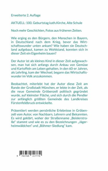 Erweiterte 2. Auflage Noch mehr Geschichten und Fotos aus früheren Zeiten. Wie erging es den Bürgern, den Menschen in Bayern, in Deutschland nach dem Krieg, bevor das Wirtschaftswunder unten ankam? Wie haben sie Deutschland aufgebaut, kamen zu Wohlstand, konnten sich in dieser Zeit ein Eigenheim bauen? Der Autor ist als kleines Kind in dieser Zeit aufgewachsen, man hat sich anfangs durch Anbau von Gemüse und Kartoffeln am Leben gehalten. In den 60-er Jahren, als Lehrling, kam der Wechsel, begann das Wirtschaftswunder im Volk anzukommen. Beobachtet, miterlebt hat der Autor diese Zeit am Rande der Großstadt München, er lebte in der Zeit, als die neue Gemeinde Gröbenzell politisch gegründet wurde, auf kleinster Fläche, und sich durch die Pendler zur anfänglich größten Gemeinde des Landkreises Fürstenfeldbruck entwickelte. Präsentiert werden persönliche Erlebnisse in Gröben-zell vom Autor, von Nachbarn, Lehrern und Bekannten.