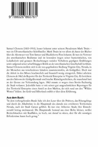Samuel Clemens (1835-1910), besser bekannt unter seinem Pseudonym Mark Twain - war ein US-amerikanischer Schriftsteller. Mark Twain ist vor allem als Autor der Bücher über die Abenteuer von Tom Sawyer und Huckleberry Finn bekannt. Er war ein Vertreter des amerikanischen Realismus und ist besonders wegen seiner humoristischen, von Lokalkolorit und genauen Beobachtungen sozialen Verhaltens geprägten Erzählungen sowie aufgrund seiner scharfzüngigen Kritik an der amerikanischen Gesellschaft berühmt. Samuel Clemens meldete sich in der neu gegründeten Siedlung Virginia City, Nevada, in der Menschen aus verschiedenen Ländern zusammentrafen, als Goldgräber. Doch war die Arbeit in den Minen beschwerlich und finanziell wenig ertragreich. Daher arbeitete Clemens ab 1862 als Reporter für den Territorial Enterprise in Virginia City. Er berichtete aus den Saloons der Goldgräberstadt und brachte Klatschgeschichten, die manchmal hart an der Grenze zur Verleumdung lagen. 1863 musste er wegen eines Streits fluchtartig die Stadt verlassen. Jedenfalls hatte er mit seinen gut ausgeschmückten Reportagen für den Territorial Enterprise einen Anteil an dem Mythos, der sich rund um den "Wilden Westen" bildete. Im Gold-und Silberland erzählt er über diese Erfahrung. Aus dem Buch: "In dem vorhergehenden Bande habe ich den Leser über die Prärieen, das Felsengebirge und durch die Alkaliwüste in die Hauptstadt des damals neu errichteten Territoriums Nevada, nach der Stadt Carson geführt. Es war eine >hölzerne< Stadt; ihre Einwohnerzahl betrug zweitausend. Die Hauptstraße bestand aus einer Reihe kleiner, weißer Bretterhäuschen mit Kaufläden, zu hoch, um darauf zu sitzen, aber für alle sonstigen Erfordernisse kaum hoch genug."