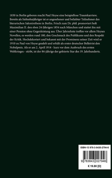Paul Heyse: Im Grafenschloß. Gesammelte Novellen Band 5 Aus: Neue Novellen. 4. Sammlung, Hertz, Berlin, 1862. Vollständige Neuausgabe mit einer Biographie des Autors. Herausgegeben von Karl-Maria Guth. Berlin 2015. Umschlaggestaltung von Thomas Schultz-Overhage unter Verwendung des Bildes: Franz Seraph Hanfstaengl, Paul Heyse, um 1860 (Ausschnitt). Gesetzt aus Minion Pro, 11 pt. Über den Autor: 1830 in Berlin geboren macht Paul Heyse eine beispiellose Traumkarriere. Bereits als Siebzehnjähriger ist er angesehener und beliebter Teilnehmer des literarischen Salontreibens in Berlin. Frisch zum Dr. phil. promoviert holt Maximilian II. den eben 24-Jährigen 1854 nach München und stattet ihn mit einer Pension ohne Gegenleistung aus. Über Jahrzehnte treffen vor allem Heyses Novellen, es werden rund 180, den Geschmack des Publikums und den Respekt der Kritik. Hochdekoriert und bekannt mit der Prominenz seiner Zeit wird er 1910 zu Paul von Heyse geadelt und erhält als erster deutscher Belletrist den Nobelpreis. Als er am 2. April 1914 - kurz vor dem Ausbruch des ersten Weltkrieges - stirbt, ist der 84-jährige der gefeierte Star des 19. Jahrhunderts.