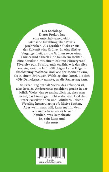 Der Soziologe Dieter Prokop hat eine unterhaltsame, leicht satirische Erzählung über Politik geschrieben. Als Erzähler blickt er aus der Zukunft »ins Grüne«. In eine fiktive Vergangenheit, als die Grünen sogar einen Kanzler und danach eine Kanzlerin stellten. Eine Kanzlerin mit einem Eskimo-Hintergrund: Diversity pur. Es wird auch erzählt, wie das alles endete, weil die Grün-Gläubigen keine Folgenabschätzung machten. Und wie der Moment kam, als in einem Erdrutsch-Wahlsieg eine Partei, die sich »Die Demokraten« nannte, an die Regierung kam.Die Erzählung enthält Vieles, das erfunden ist, also Irreales. Andererseits geschieht gerade in der Politik Vieles, das so unglaublich ist, dass man meint, das könne gar nicht wahr sein. Und das unter Politikerinnen und Politikern übliche Wording konstruiert ja oft fiktive Sachen. Aber wenn man will, kann man in dem Buch auch etwas Reales lernen. Nämlich, was Demokratie ist, sein kann und sein muss.