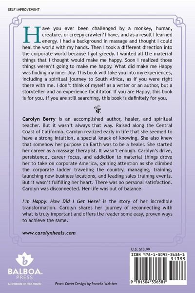 Carolyn Berry is an accomplished author, speaker, and corporate trainer. But it wasnt always that way. Raised along the Central Coast of California, Carolyn realized early in life that she seemed to have a strong intuition, a special knack of knowing and the ability to manage people and build strong foundations for businesses. She also knew that somehow her purpose on Earth was to help people. She started her career as a massage therapist. It wasnt enough. Carolyns drive, persistence, career focus, and addiction to material things drove her to take on corporate America, gaining attention as she climbed the corporate ladder traveling the country, managing, training, launching new business locations, and leading sales training events. But it wasnt fulfilling her heart. There was no personal satisfaction. Carolyn was disconnected. Her life was out of balance. Im Happy. How Did I Get Here? is the story of her incredible transformation. Carolyn shares her journey of reconnecting with what is truly important and offers the reader some easy, proven ways to achieve the same. www.carolynheals.com