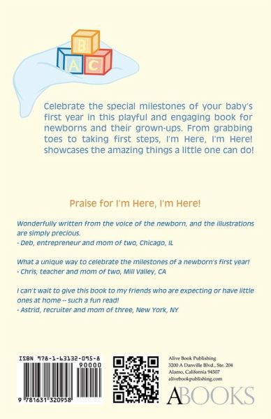 I'm Here, I'm Here by Valerie Pressley, celebrates the special milestones of your baby’s first year in this playful and engaging book for newborns and their grown-ups. From grabbing toes to taking first steps, I’m Here, I’m Here! showcases the amazing things a little one can do! This is the first of a series of six books, each one celebrating a child's age-appropriate accomplishments.