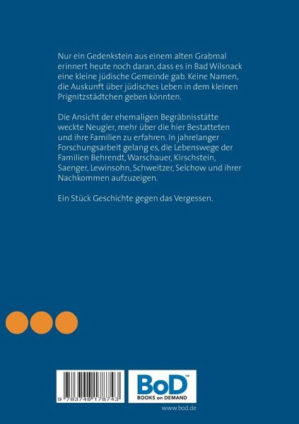 Nur ein Gedenkstein aus einem alten Grabmal erinnert heute noch daran, dass es in Bad Wilsnack eine kleine jüdische Gemeinde gab. Keine Namen, die Auskunft über jüdisches Leben in dem kleinen Prignitzstädtchen geben könnten.Die Ansicht der ehemaligen Begräbnisstätte weckte Neugier, mehr über die hier Bestatteten und ihre Familien zu erfahren. In jahrelanger Forschungsarbeit gelang es, die Lebenswege der Familien Behrendt, Warschauer, Kirschstein, Saenger, Lewinsohn, Schweitzer, Selchow und ihrer Nachkommen aufzuzeigen.Ein Stück Geschichte gegen das Vergessen.