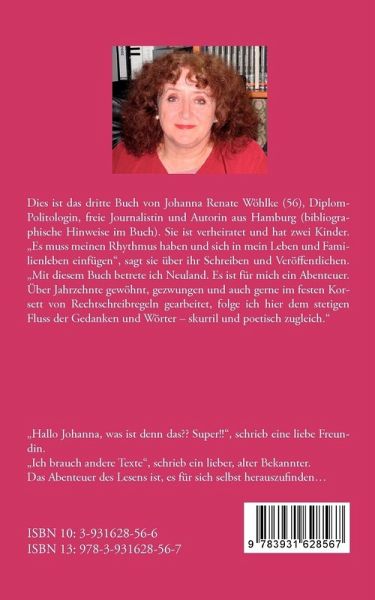 Die skurrile Poesie der Johanna Renate Wöhlke lädt ein zu einem neuen und unbekannten Leseabenteuer in das eigene Selbst. Geschrieben ohne Punkt und Komma entstehen Assoziationen, Wort- und Gedankenfelder, ineinander verwoben und verschachtelt, alles mit Allem verknüpfend, die faszinierende Gedankenreisen möglich machen.