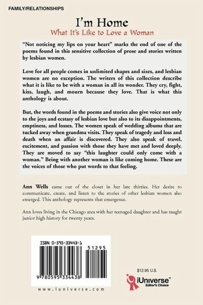 "As you feel my lips upon your heart" marks the end of one of the poems found in this sensitive collection of prose and stories written by lesbian women. Love for all people comes in unlimited shapes and sizes, and lesbian women are no exception. The writers of this collection describe what it is like to be with a woman in all its wonder. They cry, fight, kiss, laugh, and mourn because they love. That is what this anthology is about. But, the words found in the poems and stories also give voice not only to the joys and ecstasy of lesbian love but also to its disappointments, emptiness, and losses. The women speak of wedding albums that are tucked away when grandma visits. They speak of tragedy and loss and death when an affair is discovered. They also speak of travel, excitement, and passion with those they have met and loved deeply. They are moved to say "this laughter could only come with a woman." Being with another woman is like coming home. These are the voices of those who put words to that feeling.