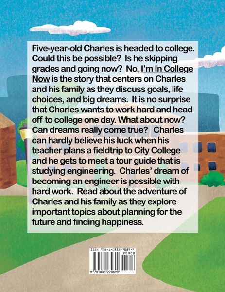 Five-year-old Charles is headed to college. Could this be possible? Is he skipping grades and going now? No, I'm In College Now is the story that centers on Charles and his family as they discuss goals, life choices, and big dreams. It is no surprise that Charles wants to work hard and head off to college one day. What about now? Can dreams really come true? Charles can hardly believe his luck when his teacher plans a fieldtrip to City College and he gets to meet a tour guide who is studying engineering. Charles' dream of becoming an engineer is possible with hard work. Read about the adventure of Charles and his family as they explore important conversations about planning for the future and finding happiness.