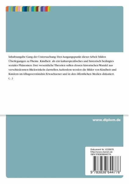 Den Ausgangspunkt dieser Arbeit bilden Überlegungen zu Thema Kindheit als ein kulturspezifisches und historisch bedingtes soziales Phänomen. Drei wesentliche Theorien sollen dessen historischen Wandel aus verschiedensten Blickwinkeln darstellen. Außerdem werden die Bilder von Kindheit und Kindern im Alltagsverständnis Erwachsener und in den öffentlichen Medien diskutiert.