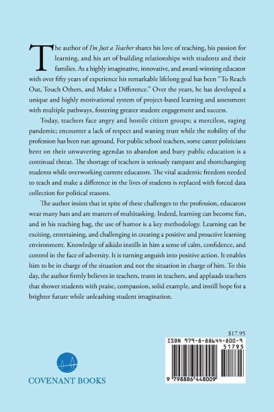 The author of I'm Just a Teacher shares his love of teaching, his passion for learning, and his art of building relationships with students and their families. As a highly imaginative, innovative, and award-winning educator with over fifty years of experience his remarkable lifelong goal has been "To Reach Out, Touch Others, and Make a Difference." Over the years, he has developed a unique and highly motivational system of project-based learning and assessment with multiple pathways, fostering greater student engagement and success. Today, teachers face angry and hostile citizen groups; a merciless, raging pandemic; encounter a lack of respect and waning trust while the nobility of the profession has been run aground. For public school teachers, some career politicians bent on their unwavering agendas to abandon and bury public education is a continual threat. The shortage of teachers is seriously rampant and shortchanging students while overworking current educators. The vital academic freedom needed to teach and make a difference in the lives of students is replaced with forced data collection for political reasons. The author insists that in spite of these challenges to the profession, educators wear many hats and are masters of multitasking. Indeed, learning can become fun, and in his teaching bag, the use of humor is a key methodology. Learning can be exciting, entertaining, and challenging in creating a positive and proactive learning environment. Knowledge of aikido instills in him a sense of calm, confidence, and control in the face of adversity. It is turning anguish into positive action. It enables him to be in charge of the situation and not the situation in charge of him. To this day, the author firmly believes in teachers, trusts in teachers, and applauds teachers that shower students with praise, compassion, solid example, and instill hope for a brighter future while unleashing student imagination.
