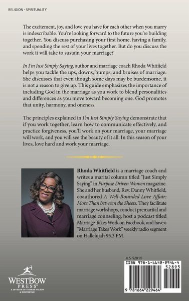 The excitement, joy, and love you have for each other when you marry is indescribable. You're looking forward to the future you're building together. You discuss purchasing your first home, having a family, and spending the rest of your lives together. But do you discuss the work it will take to sustain your marriage? In I'm Just Simply Saying, author and marriage coach Rhoda Whitfield helps you tackle the ups, downs, bumps, and bruises of marriage. She discusses that even though some days may be burdensome, it is not a reason to give up. This guide emphasizes the importance of including God in the marriage as you work to blend personalities and differences as you move toward becoming one. God promotes that unity, harmony, and oneness. The principles explained in I'm Just Simply Saying demonstrate that if you work together, learn how to communicate effectively, and practice forgiveness, you'll work on your marriage, your marriage will work, and you will see the beauty of it all. In this season of your lives, love hard and work your marriage.