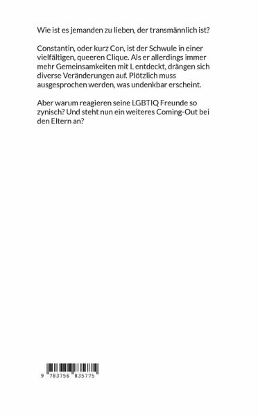 Wie ist es jemanden zu lieben, der transmännlich ist? Constantin, oder kurz Con, ist der Schwule in einer vielfältigen, queeren Clique. Als er allerdings immer mehr Gemeinsamkeiten mit L entdeckt, drängen sich diverse Veränderungen auf. Plötzlich muss ausgesprochen werden, was undenkbar erscheint.Aber warum reagieren seine LGBTIQ Freunde so zynisch? Und steht nun ein weiteres Coming-Out bei den Eltern an?