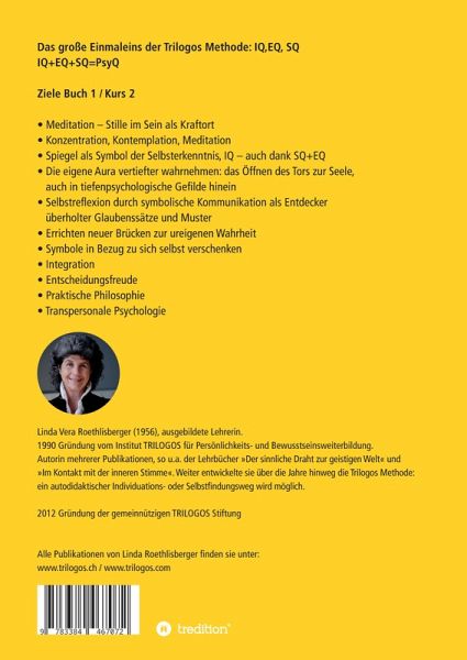 "Im Kontakt mit der inneren Stimme" - ein autodidaktischer Lehrgang in 3 Stufen:Das bedeutet ein spiritueller, autodidaktischer Individuationsweg: sich persönlich entwickeln - ein lebenslanger Prozess.Mit diesem Lehrgang, der aus 3 Stufen (zu 6 Bücher) samt viel Übungsmaterial besteht, richte ich mich an alle, die sich für ihre spirituelle Individuation interessieren. Individuation ist eine persönliche Angelegenheit. Jeder Teilnehmer lernt im Laufe der Übungen - wie einst die Muttersprache - "seine" ganz individuelle Seelen- oder Symbolsprache kennen. Er lernt innerlich erfahrene Symbole benennen, ausdrücken und in Bezug zu seiner Welt in der Welt bringen. Je nach bereits vorhandener Erfahrungswelt und Bildung sind ganz unterschiedliche Lernfelder möglich:Stufe 2: Bücher 1 - 6Das grosse Einmaleins der Trilogos Methode (IQ, EQ, SQ => IQ+EQ+SQ=PSYQ) anwenden und damit integrales Bewusstsein üben.Mit diesem Lehrgang ...- trainieren und verfeinern Sie Ihre urpersönliche, subjektive Wahrnehmung- lernen Sie, Ihre Ideen und Assoziationen zu Ihren Wahrnehmungen in Bezug zu setzen und "geschlossene Fragen" hierzu zu stellen, die mit einem Ja, Jein oder Nein bewantwortet werden können- überprüfen Sie unmittelbar Ihre Gedanken-und Gefühlssprache, Ihre Intuition- stellen Sie ganzheitliche Bezüge (aus der Kraft Ihres PsyQ) zu Ihrem Alltag her- treffen Sie verantwortungsvolle Entscheidungen- erleben und erkennen Sie neue Handlungsmöglichkeiten für Ihre drei Lebensbereiche: Gesundheit, Beziehung(en), Beruf (oder Berufung)- bilden Sie aus Ihrer Mitschöpferkraft und dank Ihrer Kreativität ein integrales Bewusstsein: Innovation wird durch Intuition möglich - Ihre Kraft und vor allem die Freude am eigenen Gestalten Ihres Lebens entfaltet sich.