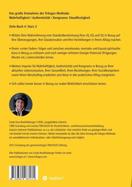 Linda Vera Roethlisberger (1956), ausgebildete Lehrerin Parallel dazu bildete sie in Bern und Paris ihr Talent als Künstlerin aus. Ihre eigenen medialen Anlagen bildete sie weiter als Schülerin von Silvia Wallimann, Prof. Dr. Milan Ryzl und Gordon Higginson und arbeitet seither u.a. auch als Medium. 1990 Gründung vom Institut TRILOGOS für Persönlichkeits- und Bewusstseinsschulung. Autorin mehrerer Publikationen, so u.a. der Lehrbücher 'Der sinnliche Draht zur geistigen Welt' und 'Im Kontakt mit der inneren Stimme'. Weiter entwickelte sie über die Jahre hinweg die TRILOGOS®Methode: ein autodidaktischer Individuations- oder Selbstfindungsweg wird möglich. 2012 Gründung der gemeinnützigen TRILOGOS Stiftung. _______________________________________________________________________________ Linda Vera Roethlisberger (1956), certified teacher At the same time, she developed her artistic talent in Bern and Paris. She developed and cultivated her own mediumistic capabilities as a student of Silvia Wallimann, Prof. Dr. Milan Ryzl and Gordon Higginson, and has since also been working as a medium. 1990 ¿ Founding of TRILOGOS, an institute for personality and consciousness training. Author of numerous publications, among them the guidebooks The Sensory Channel to the Spiritual World (Der sinnliche Draht zur geistigen Welt) and In Touch With Your Inner Voice (Im Kontakt mit der inneren Stimme). Over the years, she has also developed the Trilogos Method, allowing for self-guided individuation or self-discovery. 2012 ¿ Founding of the charitable Trilogos Foundation