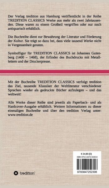 Diese Hardcover-Ausgabe ist Teil der TREDITION CLASSICS. Der Verlag tredition aus Hamburg veröffentlicht in der Buchreihe TREDITION CLASSICS Werke aus mehr als zwei Jahrtausenden. Diese waren zu einem Großteil vergriffen oder nur noch antiquarisch erhältlich. Mit TREDITION CLASSICS verfolgt tredition das Ziel, tausende Klassiker der Weltliteratur verschiedener Sprachen wieder als gedruckte Bücher zu verlegen und das weltweit! Die Buchreihe dient zur Bewahrung der Literatur und Förderung der Kultur. Sie trägt so dazu bei, dass viele tausend Werke nicht in Vergessenheit geraten.