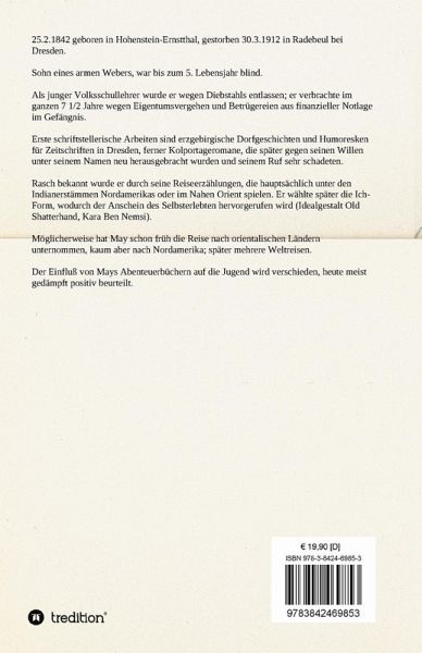 Karl May (1842-1912) war das fünfte von 14 Kindern einer armen Weberfamilie aus Ernstthal/Sachsen. Vom Studium am Lehrerseminar wurde er zunächst ausgeschlossen, nachdem er Kerzenreste unterschlagen hatte. Später konnte er die Ausbildung fortsetzen, arbeitete nur 14 Tage in seinem Beruf, bevor er wieder des Diebstahls bezichtigt und von der Liste der Kandidaten gestrichen wurde. Wegen Diebstahls, Betrugs und Hochstapelei wurde er in den Jahren darauf immer wieder verhaftet und monatelang festgesetzt. Die Jahre zwischen 1870 und 1874 verbrachte er im Zuchthaus Waldheim. Erst viele Jahre nach dem Erscheinen des akribisch recherchierten Orientzyklus reiste Karl May tatsächlich in den Orient. Karl May war lange Zeit einer der meistgelesenen deutschen Schriftsteller. Er starb1912 in Radebeul.