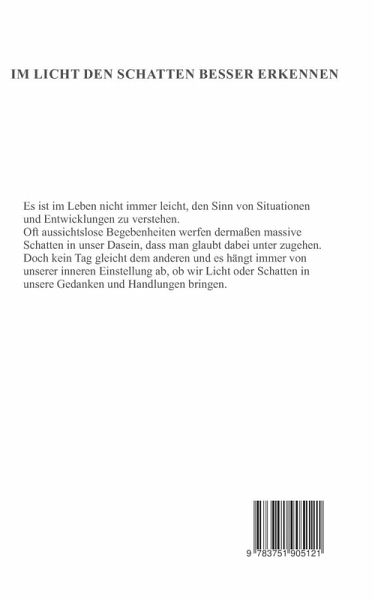 Es ist im Leben nicht immer leicht, den Sinn von Situationen und Entwicklungen zu verstehen. Oft aussichtslose Begebenheiten werfen dermaßen massive Schatten in unser Dasein, dass man glaubt dabei unter zugehen. Doch kein Tag gleicht dem anderen und es hängt immer von unserer inneren Einstellung ab, ob wir Licht oder Schatten in unsere Gedanken und Handlungen bringen.