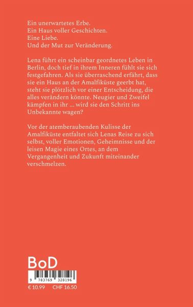 Ein unerwartetes Erbe. Ein Haus voller Geschichten. Eine Liebe. Und der Mut zur Veränderung. Lena führt ein scheinbar geordnetes Leben in Berlin, doch tief in ihrem Inneren fühlt sie sich festgefahren. Als sie überraschend erfährt, dass sie ein Haus an der Amalfiküste geerbt hat, steht sie plötzlich vor einer Entscheidung, die alles verändern könnte. Neugier und Zweifel kämpfen in ihr ... wird sie den Schritt ins Unbekannte wagen? Vor der atemberaubenden Kulisse der Amalfiküste entfaltet sich Lenas Reise zu sich selbst, voller Emotionen, Geheimnisse und der leisen Magie eines Ortes, an dem Vergangenheit und Zukunft miteinander verschmelzen. Dieser Roman ist eine bewegende Geschichte über Neuanfänge und die Kraft der Liebe.