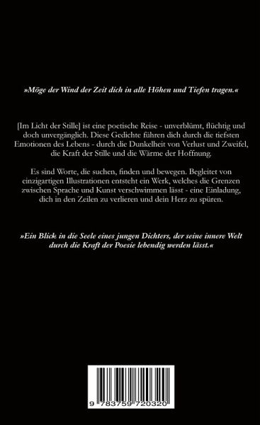 [Im Licht der Stille] ist eine poetische Reise - ehrlich, flüchtig und doch unvergänglich. Diese Gedichte führen dich durch die tiefsten Emotionen des Lebens - durch die Dunkelheit von Verlust und Zweifel, die Kraft der Stille und die Wärme der Hoffnung. Es sind Worte, die berühren, anregen und bewegen. Begleitet von einzigartigen Illustrationen, verschwimmen hier die Grenzen zwischen Kunst und Poesie - Dieses Werk lädt dich ein, dich von den Zeilen entführen zu lassen und dein eigenes Herz zu spüren.