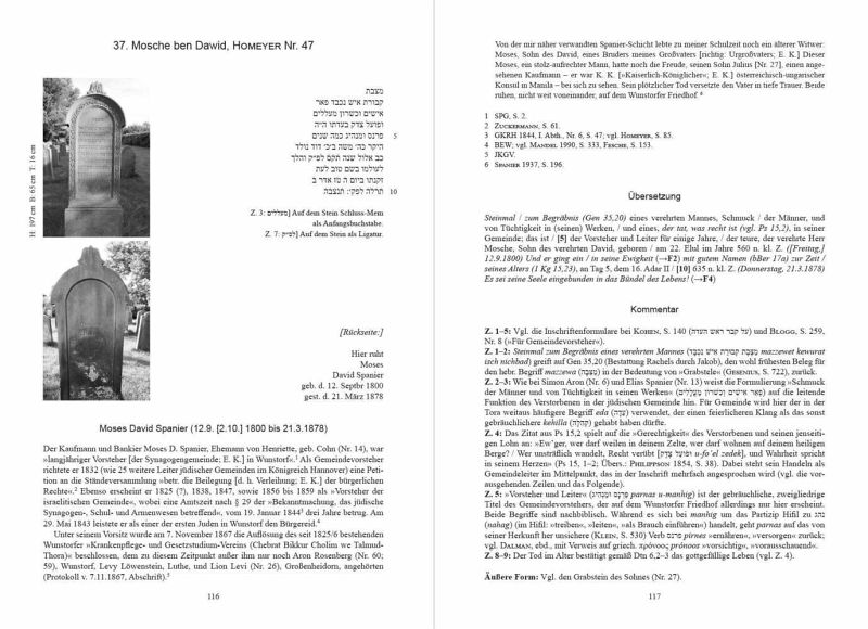 Die Synagogengemeinde Wunstorf war eine der vielen jüdischen Landgemeinden in Königreich und preußischer Provinz Hannover im 19. und frühen 20. Jahrhundert. Heute noch sichtbares Zeugnis dieser Gemeinde ist vor allem der von 1830 bis 1938 belegte neue Friedhof. Dessen noch erhaltene Grabsteine erzählen, zusammen mit weiteren Quellen, die Geschichte der Gemeinde und der Menschen, die ihr angehörten. Dabei umfasst die Lebenszeit der hier Begrabenen mit den Jahren von ca. 1750 bis 1938 eine bedeutsame Epoche des deutschen Judentums: den von Rückschlägen gekennzeichneten Weg zur bürgerlichen Gleichstellung, innerjüdisch begleitet von der Entstehung neuer Strömungen wie Reformjudentum und Neo-Orthodoxie - ein wichtiges Kapitel deutsch-jüdischer Geschichte im Schatten des Holocausts.