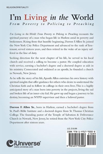 I'm Living in the World: From Poverty to Policing to Preaching recounts the spiritual journey of a man who began life in Harlem amid its poverty and brokenness. Rising from that humble beginning, Darron F. Allen Sr. joined the New York City Police Department and advanced to the rank of lieutenant, served sixteen years, and then retired in the wake of an injury suffered in the line of duty. Seeking direction for the next chapter of his life, he served in his local church and received a calling to become a pastor. He coupled education with service, earning a bachelor's degree and a doctoral degree as aids in his ministry. Consecrated and ordained as an apostle, he founded a church in Newark, New Jersey. As he tells the story of his life, Apostle Allen entwines his own history with spiritual insights that offer guidance for others who desire to understand the Christian faith and to follow its callings in their own lives. This is a highly anticipated story of a man born into poverty in the projects, living the sad and broken life of an inner-city kid. He grew up and began a journey to his destiny, becoming an NYPD supervisor and then a beloved pastor.