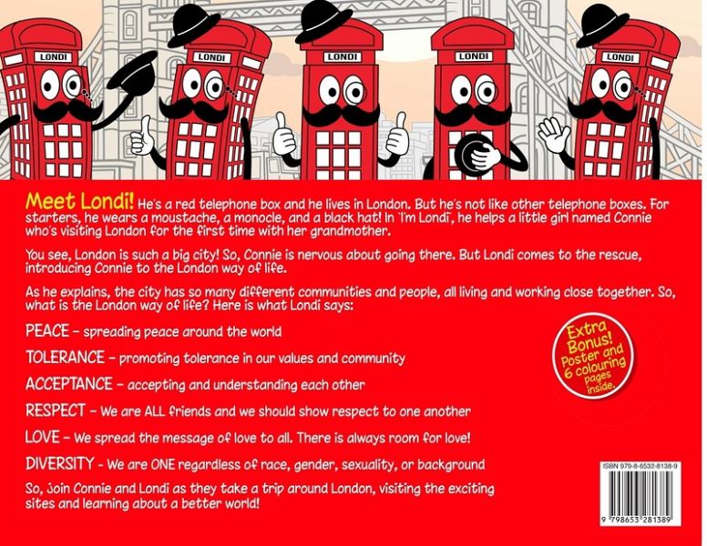 "I'M LONDI. Diversity Adventures in LONDON with LONDI" (Beautiful Picture Book for children with Extra Bonus! Colorful Poster and 6 Colouring Pages for children Activity inside.) Meet Londi! He's a red telephone box and he lives in London. But he's not like other telephone boxes. For starters, he wears a moustache, a monocle, and a black hat! In 'I'm Londi', he helps a little girl named Connie who's visiting London for the first time with her grandmother. You see, London is such a big city! So, Connie is nervous about going there. But Londi comes to the rescue, introducing Connie to the London way of life. As he explains, the city has so many different communities and people, all living and working close together. So, what is the London way of life? Here is what Londi says: PEACE - spreading peace around the world TOLERANCE - promoting tolerance in our values and community ACCEPTANCE - accepting and understanding each other RESPECT - We are ALL friends and we should show respect to one another LOVE - We spread the message of love to all. There is always room for love! DIVERSITY - We are ONE regardless of race, gender, sexuality, or background So, join Connie and Londi as they take a trip around London, visiting the exciting sites and learning about a better world!