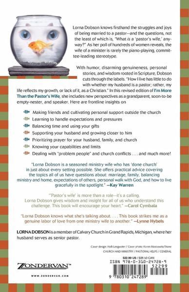 Lorna Dobson knows firsthand the struggles and joys of being married to a pastor---and the questions, not the least of which is, 'What is a 'pastor's wife, ' anyway?' As her poll of hundreds of women reveals, the wife of a minister is rarely the piano-playing, committee-leading stereotype. With humor, disarming genuineness, personal stories, and wisdom rooted in Scripture, Dobson cuts through the labels. 'How I live has little to do with whether my husband is a pastor; rather, my life reflects my growth, or lack of it, as a Christian.' In this revised edition of I'm More Than the Pastor's Wife, she includes new perspectives as a grandparent, soon-to-be empty-nester, and speaker. Here are frontline insights on -Making friends and cultivating personal support outside the church -Learning to handle expectations and pressures -Balancing time and using your gifts -Supporting your husband and growing closer to him -Prioritizing prayer for your husband, family, and church -Knowing your capabilities and limits -Dealing with 'problem people' and church conflicts . . . and much more!