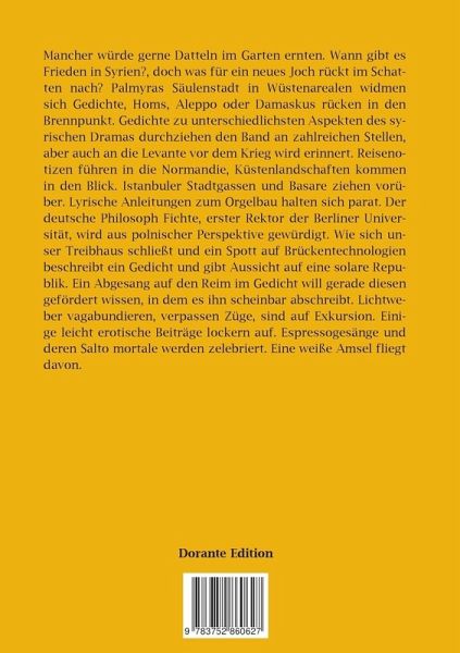Mancher würde gerne Datteln im Garten ernten. Wann gibt es Frieden in Syrien? Doch was für ein neues Joch rückt im Schatten nach? Palmyras Säulenstadt in Wüstenarealen widmen sich Gedichte, Homs, Aleppo oder Damaskus rücken in den Brennpunkt. Gedichte zu unterschiedlichsten Aspekten des syrischen Dramas durchziehen den Band an zahlreichen Stellen, aber auch an die Levante vor dem Krieg wird erinnert. Reisenotizen führen in die Normandie, Küstenlandschaften kommen in den Blick. Istanbuler Stadtgassen und Basare ziehen vorüber. Lyrische Anleitungen zum Orgelbau halten sich parat. Der deutsche Philosoph Fichte, erster Rektor der Berliner Universität, wird aus polnischer Perspektive gewürdigt. Wie sich unser Treibhaus schließt und ein Spott auf Brückentechnologien beschreibt ein Gedicht und gibt Aussicht auf eine solare Republik. Ein Abgesang auf den Reim im Gedicht will gerade diesen gefördert wissen, in dem es ihn scheinbar abschreibt. Lichtweber vagabundieren, verpassen Züge, sindauf Exkursion. Einige leicht erotische Beiträge lockern auf. Espressogesänge und deren Salto mortale werden zelebriert. Eine weiße Amsel fliegt davon.
