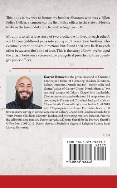 This book is my way to honor my brother Shannon who was a fallen Police Officer. Shannon was the first Police officer in the state of Florida to die in the line of duty due to contracting Covid-19. My aim is to tell a love story of two brothers who lived in each other's world from childhood years into young adult years. Two brothers who eventually went opposite directions but found their way back to each other because of the bond of love. This is the story of how love bridged the chasm between a conservative evangelical preacher and an openly gay police officer.