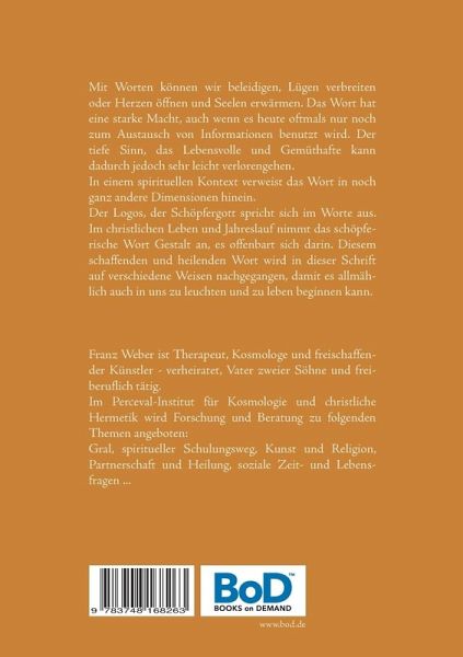 Mit Worten können wir beleidigen, Lügen verbreiten oder Herzen öffnen und Seelen erwärmen. Das Wort hat eine starke Macht, auch wenn es heute oftmals nur noch zum Austausch von Informationen benutzt wird. Der tiefe Sinn, das Lebensvolle und Gemüthafte kann dadurch jedoch sehr leicht verlorengehen.In einem spirituellen Kontext verweist das Wort in noch ganz andere Dimensionen hinein. Der Logos, der Schöpfergott spricht sich im Worte aus. Im christlichen Leben und Jahreslauf nimmt das schöpfe-rische Wort Gestalt an, es offenbart sich darin. Diesem schaffenden und heilenden Wort wird in dieser Schrift auf verschiedene Weisen nachgegangen, damit es allmählich auch in uns zu leuchten und zu leben beginnen kann.