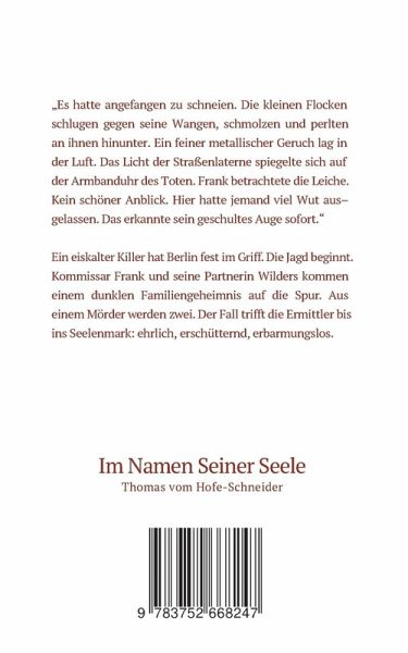 "Es hatte angefangen zu schneien. Die kleinen Flocken schlugen gegen seine Wangen, schmolzen und perlten an ihnen hinunter. Ein feiner metallischer Geruch lag in der Luft. Das Licht der Straßenlaterne spiegelte sich auf der Armbanduhr des Toten. Frank betrachtete die Leiche. Kein schöner Anblick. Hier hatte jemand viel Wut ausgelassen. Das erkannte sein geschultes Auge sofort."Ein eiskalter Killer hat Berlin fest im Griff. Die Jagd beginnt. Kommissar Frank und seine Partnerin Wilders kommen einem dunklen Familiengeheimnis auf die Spur. Aus einem Mörder werden zwei. Der Fall trifft die Ermittler bis ins Seelenmark: ehrlich, erschütternd, erbarmungslos.