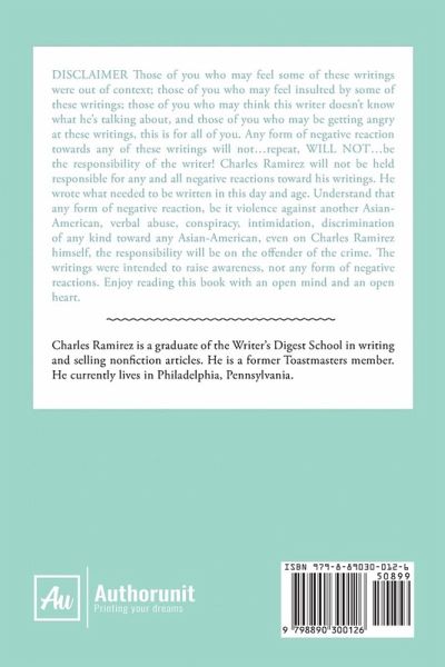 DISCLAIMER Those of you who may feel some of these writings were out of context; those of you who may feel insulted by some of these writings; those of you who may think this writer doesn't know what he's talking about, and those of you who may be getting angry at these writings, this is for all of you. Any form of negative reaction towards any of these writings will not...repeat, WILL NOT...be the responsibility of the writer! Charles Ramirez will not be held responsible for any and all negative reactions toward his writings. He wrote what needed to be written in this day and age. Understand that any form of negative reaction, be it violence against another Asian-American, verbal abuse, conspiracy, intimidation, discrimination of any kind toward any Asian-American, even on Charles Ramirez himself, the responsibility will be on the offender of the crime. The writings were intended to raise awareness, not any form of negative reactions. Enjoy reading this book with an open mind and an open heart.