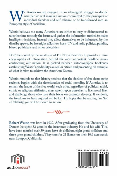 We Americans are engaged in an ideological struggle to decide whether we will remain a nation committed to the principles of individual freedom and self reliance or be transformed into an European style of socialism. Westin believes too many Americans are either to busy or disinterested to take the time to study the issues and gather the information needed to make intelligent decisions. Instead they allow themselves to be influenced by the diatribe spewed by late night talk show hosts, TV and radio political pundits, biased politicians and other celebrities. Don't be fooled by the small size of I'm Not a Celebrity. It provides a mini encyclopedia of information behind the most important headline issues confronting our nation. It is packed between autobiographic bookends establishing Westin's credibility as a senior citizen and presenting his example of what it takes to achieve the American Dream. Westin reminds us that history teaches that the decline of free democratic societies begins with the deterioration of social morality. If America is to remain the leader of the free world, each of us, regardless of political, racial, ethnic or religious affiliation, must take it upon ourselves to live moral lives and challenge those who turn their backs on common decency. If we don't, the freedoms we have enjoyed will be lost. He hopes that by reading I'm Not a Celebrity, you will be moved to action.