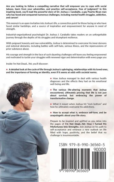 In "I'm Not Dead...Yet: How I Turned My Misfortunes Into Strengths," Industrial-Organizational Psychologist Dr. Joshua J. Caraballo takes readers on an unforgettable journey through the depths of his personal struggles and triumphant resilience. With poignant honesty and raw vulnerability, Joshua shares his battles with mental health, addiction, self-hate, surviving cancer, and coming to terms with his queer identity. This memoir is an open invitation into Joshua's life, a connection point for those facing or who have faced similar hardships, and a beacon of hope and empowerment for anyone in need of strength. Through his experiences, Joshua illustrates that despite monumental setbacks, it is possible to emerge stronger and more resilient. Readers will glean valuable insights into the power of resilience, the lessons inherent in adversity, and the importance of self-acceptance free from judgment. Joshua's narrative offers coping mechanisms for societal taboos, strategies for managing mental and physical health challenges, and a profound message about the significance of self-acceptance. As a cisgender, gay Puerto Rican survivor, Joshua's perspective is both unique and universal. His memoir speaks to individuals seeking inspiration, understanding of the human condition, and guidance on navigating various challenges, especially those within the LGBTQ+ community. The writing style is marked by maturity, heartfelt introspection, vivid descriptions, and relatable anecdotes that evoke a spectrum of emotions. Themes of survival, empowerment, overcoming adversity, self-discovery, and the journey toward self-love and acceptance resonate throughout the narrative. While there are other books covering similar topics, "I'm Not Dead...Yet" distinguishes itself as a deeply personal account that resonates on a profound level. Joshua's memoir is not just a story; it is a testament to the resilience of the human spirit and the transformative power of embracing one's truth. For readers seeking solace, inspiration, and the courage to confront their own challenges head-on, "I'm Not Dead...Yet" is a must-read. Joshua's memoir is poised to make a meaningful contribution to the literary landscape, offering hope and healing to all who turn its pages.
