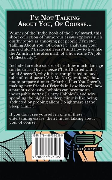 Winner of the "Indie Book of the Day" award, this short collection of humorous essays explores such quirky topics as annoying pet people ("I'm Not Talking About You, Of Course"), analyzing your inner child ("Irrational Fears") and how to live like the Amish in the aftermath of a hurricane ("A Jolt of Electricity"). Included are also stories of just how much damage can be caused by a sneeze ("It All Started with a Loud Sneeze"), why it is so complicated to buy a tube of toothpaste ("Ask Me No Questions"), how not to prepare dinner ("Martha, I Let You Down"), making new friends ("Friends in Low Places"), how a parent's obsessive hobbies can become an inescapable vortex ("Crazy Hobbies"), and why spending the night in a sleep clinic is like being abducted by probing aliens ("Nightmare at the Sleep Clinic"). If you don't see yourself in one of these entertaining essays, then I'm not talking about you, of course...