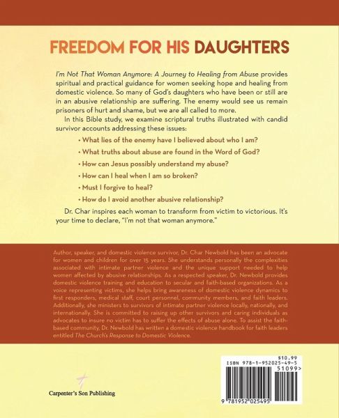 Freedom for His Daughters I'm Not That Woman Anymore: A Journey to Healing from Abuse provides guidance for women embracing the opportunity to receive hope and healing through the love of God. So many of God's daughters who have been or still are in an abusive relationship are suffering. The enemy would see us remain prisoners of hurt and shame, but we are all called to more In this Bible study, we team up with Scripture to bring biblical truth to these issues of the heart: * What lies of the enemy have I believed about who I am? * What truths are found in the Word of God about abuse? * How can Jesus possibly understand my abuse? * How do I avoid another abusive relationship? * Is forgiveness a part of healing? This study offers the truths needed to move from hurt and shame to joy and acceptance as together we seek a life free from the bondage of abuse.