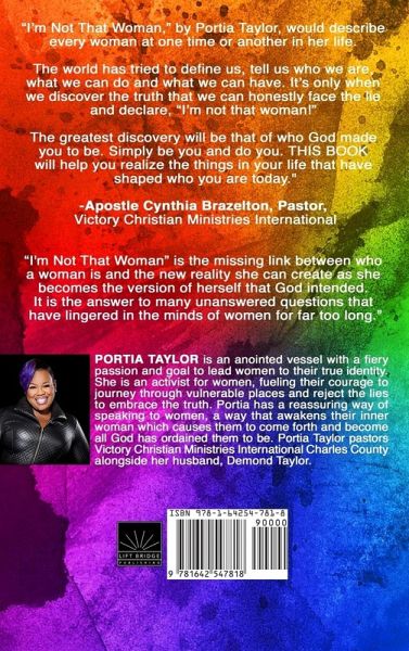 "I’m Not That Woman," by Portia Taylor, would describe every woman at one time or another in her life. The world has tried to define us, tell us who we are, what we can do and what we can have. It’s only when we discover the truth that we can honestly face the lie and declare, "I’m not that woman!" The greatest discovery will be that of who God made you to be. Simply be you and do you. THIS BOOK will help you realize the things in your life that have shaped who you are today." -Apostle Cynthia Brazelton, Pastor, Victory Christian Ministries International "I'm Not That Woman" is the missing link between who a woman is and the new reality she can create as she becomes the version of herself that God intended. It is the answer to many unanswered questions that have lingered in the minds of women for far too long."