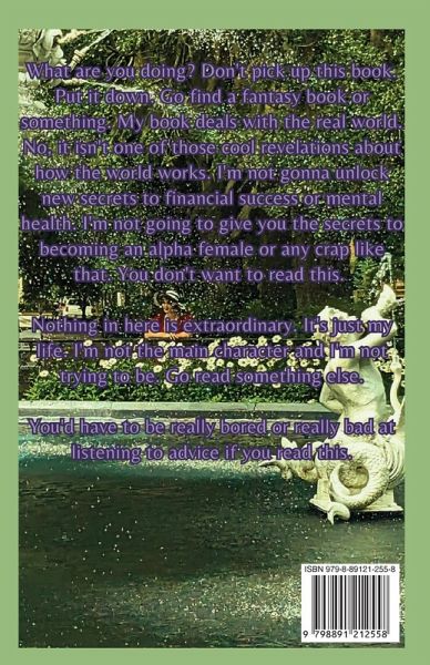 What are you doing? Don't click on this book. Go away. Go find a fantasy book or something. My book deals with the real world. No, it isn't one of those cool revelations about how the world works. I'm not gonna unlock new secrets to financial success or mental health. I'm not going to give you the secrets to becoming an alpha female or any crap like that. You don't want to read this. Nothing in here is extraordinary. It's just my life. I'm not the main character and I'm not trying to be. Go read something else. You'd have to be really bored or really bad at listening to advice if you read this.