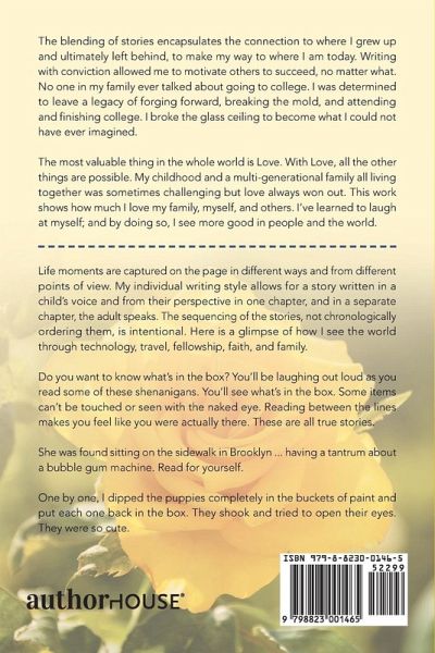 Do you want to know what's in the box? You'll be laughing out loud as you read some of these shenanigans. You'll see what's in the box. Some items can't be touched or seen with the naked eye. Reading between the lines makes you feel like you were actually there. These are all true stories. The memory of my childhood and a multi-generational family all living together was sometimes challenging but love always won out. I've learned to laugh at myself and by doing so I see more good in the world. She was found sitting on the sidewalk in Brooklyn ... having a tantrum about a bubble gum machine. Read for yourself. I believe the most valuable thing in the whole world, much less my box, is Love. Because with Love, all the other things are possible. You will see that my life was bringing me here all along.