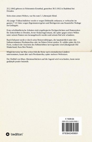 Karl May (1842-1912) war das fünfte von 14 Kindern einer armen Weberfamilie aus Ernstthal/Sachsen. Vom Studium am Lehrerseminar wurde er zunächst ausgeschlossen, nachdem er Kerzenreste unterschlagen hatte. Später konnte er die Ausbildung fortsetzen, arbeitete nur 14 Tage in seinem Beruf, bevor er wieder des Diebstahls bezichtigt und von der Liste der Kandidaten gestrichen wurde. Wegen Diebstahls, Betrugs und Hochstapelei wurde er in den Jahren darauf immer wieder verhaftet und monatelang festgesetzt. Die Jahre zwischen 1870 und 1874 verbrachte er im Zuchthaus Waldheim. Erst viele Jahre nach dem Erscheinen des akribisch recherchierten Orientzyklus reiste Karl May tatsächlich in den Orient. Karl May war lange Zeit einer der meistgelesenen deutschen Schriftsteller. Er starb1912 in Radebeul.