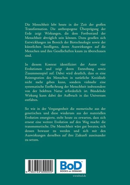 Die Menschheit lebt heute in der Zeit der großen Transformation. Die anthropogene Überprägung der Erde zeigt Wirkungen, die dem Fortbestand der Menschheit abträglich sein können. Dazu gesellen sich Entwicklungen im Bereich der Biotechnologie sowie der künstlichen Intelligenz, deren Auswirkungen auf die Menschen und ihre Gesellschaften kaum zu überschauen sind. In diesem Kontext identifiziert der Autor vier Evolutionen und zeigt deren Entstehung sowie Zusammenspiel auf. Dabei wird deutlich, dass es eine Reintegration des Menschen in natürliche Kreisläufe nicht mehr geben kann, sondern vielmehr eine systematische Entflechtung der Menschheit insbesondere von der belebten Natur erforderlich ist. Bündelnde Wirkung kann dabei der Aufbruch in das Universum entfalten.So wie in der Vergangenheit die memetische aus der genetischen und diese wiederum aus der materiellen Evolution emergierte, steht heute zu erwarten, dass sich erneut eine weitere Evolution auf den Weg macht: die transmemetische. Die Menschheit wäre gut beraten, sich dessen bewusst zu werden und sich mit den Auswirkungen derselben auf ihre Zukunft auseinander zu setzen.