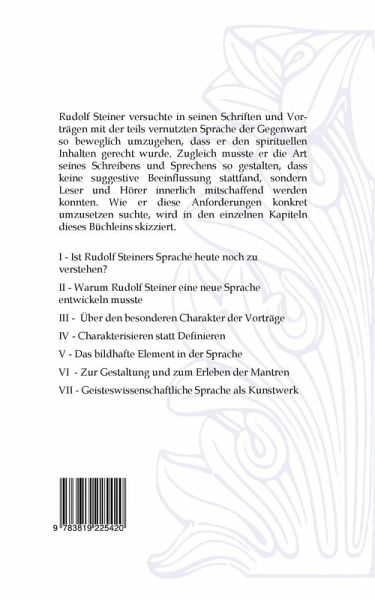 Rudolf Steiner versuchte in seinen Schriften und Vorträgen mit der teils vernutzten Sprache der Gegenwart so beweglich umzugehen, dass er den spirituellen Inhalten gerecht wurde. Zugleich musste er die Art seines Schreibens und Sprechens so gestalten, dass keine suggestive Beeinflussung stattfand, sondern Leser und Hörer innerlich mitschaffend werden konnten. Wie er diese Anforderungen konkret umzusetzen suchte, wird in den einzelnen Kapiteln dieses Büchleins skizziert. I - Ist Rudolf Steiners Sprache heute noch zu verstehen? II - Warum Rudolf Steiner eine neue Sprache entwickeln musste III - Über den besonderen Charakter der Vorträge IV - Charakterisieren statt Definieren V - Das bildhafte Element in der Sprache VI - Zur Gestaltung und zum Erleben der Mantren VII - Geisteswissenschaftliche Sprache als Kunstwerk