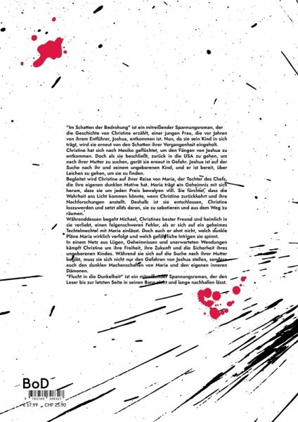 "Im Schatten der Bedrohung" ist ein mitreißender Spannungsroman, der die Geschichte von Christine erzählt, einer jungen Frau, die vor Jahren von ihrem Entführer, Joshua, entkommen ist. Nun, da sie sein Kind in sich trägt, wird sie erneut von den Schatten ihrer Vergangenheit eingeholt. Christine hat sich nach Mexiko geflüchtet, um den Fängen von Joshua zu entkommen. Doch als sie beschließt, zurück in die USA zu gehen, um nach ihrer Mutter zu suchen, gerät sie erneut in Gefahr. Joshua ist auf der Suche nach ihr und seinem ungeborenen Kind, und er ist bereit, über Leichen zu gehen, um sie zu finden. Begleitet wird Christine auf ihrer Reise von Maria, der Tochter des Chefs, die ihre eigenen dunklen Motive hat. Maria trägt ein Geheimnis mit sich herum, dass sie um jeden Preis bewahren will. Sie fürchtet, dass die Wahrheit ans Licht kommen könnte, wenn Christine zurückkehrt und ihre Nachforschungen anstellt. Deshalb ist sie entschlossen, Christine loszuwerden und setzt alles daran, sie zu sabotieren und aus dem Weg zu räumen. Währenddessen begeht Michael, Christines bester Freund und heimlich in sie verliebt, einen folgenschweren Fehler, als er sich auf ein geheimes Techtelmechtel mit Maria einlässt. Doch auch er ahnt nicht, welch dunkle Pläne Maria wirklich verfolgt und welch gefährliche Intrigen sie spinnt. In einem Netz aus Lügen, Geheimnissen und unerwarteten Wendungen kämpft Christine um ihre Freiheit, ihre Zukunft und die Sicherheit ihres ungeborenen Kindes. Während sie sich auf die Suche nach ihrer Mutter begibt, muss sie sich nicht nur den Gefahren von Joshua stellen, sondern auch den dunklen Machenschaften von Maria und den eigenen inneren Dämonen. "Flucht in die Dunkelheit" ist ein mitreißender Spannungsroman, der den Leser bis zur letzten Seite in seinen Bann zieht und lange nachhallen lässt.