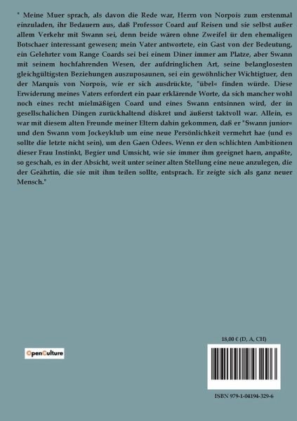 " Meine Muer sprach, als davon die Rede war, Herrn von Norpois zum erstenmal einzuladen, ihr Bedauern aus, daß Professor Coard auf Reisen und sie selbst außer allem Verkehr mit Swann sei, denn beide wären ohne Zweifel ür den ehemaligen Botschaer interessant gewesen; mein Vater antwortete, ein Gast von der Bedeutung, ein Gelehrter vom Range Coards sei bei einem Diner immer am Platze, aber Swann mit seinem hochfahrenden Wesen, der aufdringlichen Art, seine belanglosesten gleichgültigsten Beziehungen auszuposaunen, sei ein gewöhnlicher Wichtigtuer, den der Marquis von Norpois, wie er sich ausdrückte, "übel« finden würde. Diese Erwiderung meines Vaters erfordert ein paar erklärende Worte, da sich mancher wohl noch eines recht mielmäßigen Coard und eines Swann entsinnen wird, der in gesellschalichen Dingen zurückhaltend diskret und äußerst taktvoll war. Allein, es war mit diesem alten Freunde meiner Eltern dahin gekommen, daß er "Swann junior« und den Swann vom Jockeyklub um eine neue Persönlichkeit vermehrt hae (und es sollte die letzte nicht sein), um den Gaen Odees. Wenn er den schlichten Ambitionen dieser Frau Instinkt, Begier und Umsicht, wie sie immer ihm geeignet haen, anpaßte, so geschah, es in der Absicht, weit unter seiner alten Stellung eine neue anzulegen, die der Geährtin, die sie mit ihm teilen sollte, entsprach. Er zeigte sich als ganz neuer Mensch."