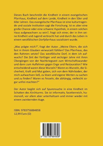 Dieses Buch beschreibt die Kindheit in einem evangelischen Pfarrhaus, Kindheit auf dem Lande, Kindheit in den 50er und 60er Jahren. Das evangelische Pfarrhaus ist eine kulturtragende und soziale Institution sagt die Forschung. Ist es aber eine große Chance oder eine schwere Hypothek, in einem solchen Haus aufgewachsen zu sein?, fragt sich einer, der in ihm seine Kindheit und Jugend verbracht hat und durch das Leben in einem westfälischen Dorfpfarrhaus sozialisiert wurde. "Was prägte mich?", fragt der Autor. "Meine Eltern, die sich fest in ihrem Glauben verwurzelt fühlten? Das Pfarrhaus, das den Rahmen setzte? Das westfälische Dorf, in dem ich aufwuchs? Die Zeit der fünfziger und sechziger Jahre mit ihren Übergängen von der Nachkriegszeit zum Wirtschaftswunder und dann zum Auflehnen gegen Enge und Restauration? Wie entscheidend waren diese Wurzeln? Waren es Wurzeln, die Sicherheit, Kraft und Mut gaben, sich von dem Nährboden, der mich aufwachsen ließ, zu lösen und eigene Werten zusuchen und zu finden? Waren es Fesseln, die abhängig, vielleicht sogar unfrei machten?" Der Autor begibt sich auf Spurensuche in eine Kindheit im Schatten des Kirchturms. Sie ist informativ, facettenreich, humorvoll, vor allem aber unterhaltsam und immer wieder mit einem zwinkernden Auge.