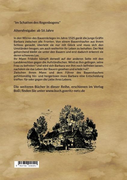 "Im Schatten des Regenbogens"Altersfreigabe: ab 16 JahreIn den Wirren des Bauernkrieges im Jahre 1525 gerät die junge Gräfin Barbara zwischen alle Fronten. Von einem Bauernhaufen aus ihrem Schloss geraubt, überlebt sie nur mit Glück und muss sich den Umständen beugen, um auch weiterhin ihr Leben zu behalten. Der Not gehorchend bleibt sie unter den Bauern und erst dadurch erkennt sie deren schweres Los. Ihr Mann Fridolin kämpft derweil auf der anderen Seite mit den Landsknechten gegen die Aufständischen. Wird es ihm gelingen, seine Frau zu befreien? Und wird sich Barbara von ihm noch befreien lassen, nachdem sie das Leben der Bauern gesehen und erlebt hat? Zwischen ihrem Mann und dem Führer des Bauernhaufens gefühlsmäßig hin- und hergerissen muss Barbara eine Entscheidung treffen: für oder gegen die Liebe ihres Lebens.Die weiteren Bücher in dieser Reihe, erschienen im Verlag BoD, finden Sie unter www.buch.goeritz-netz.de