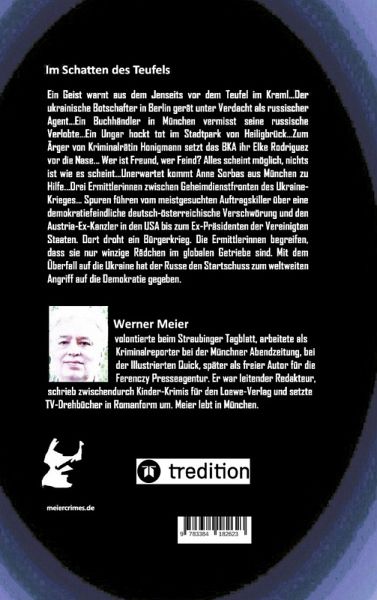 Ein Geist warnt aus dem Jenseits vor dem Teufel im Kreml...Der ukrainische Botschafter in Berlin gerät unter Verdacht als russischer Agent...Ein Buchhändler in München vermisst seine russische Verlobte...Ein Ungar hockt tot im Stadtpark von Heiligbrück... Wer ist Freund, wer Feind?... Alles scheint möglich, nichts ist wie es scheint...Drei unerschrockene Ermittlerinnen finden sich zwischen Geheimdienstfronten des Ukraine-Krieges... Spuren führen vom meistgesuchten Auftragskiller über eine demokratiefeindliche deutsch-österreichische Verschwörung und den Austria-Ex-Kanzler in den USA bis zum…mehr